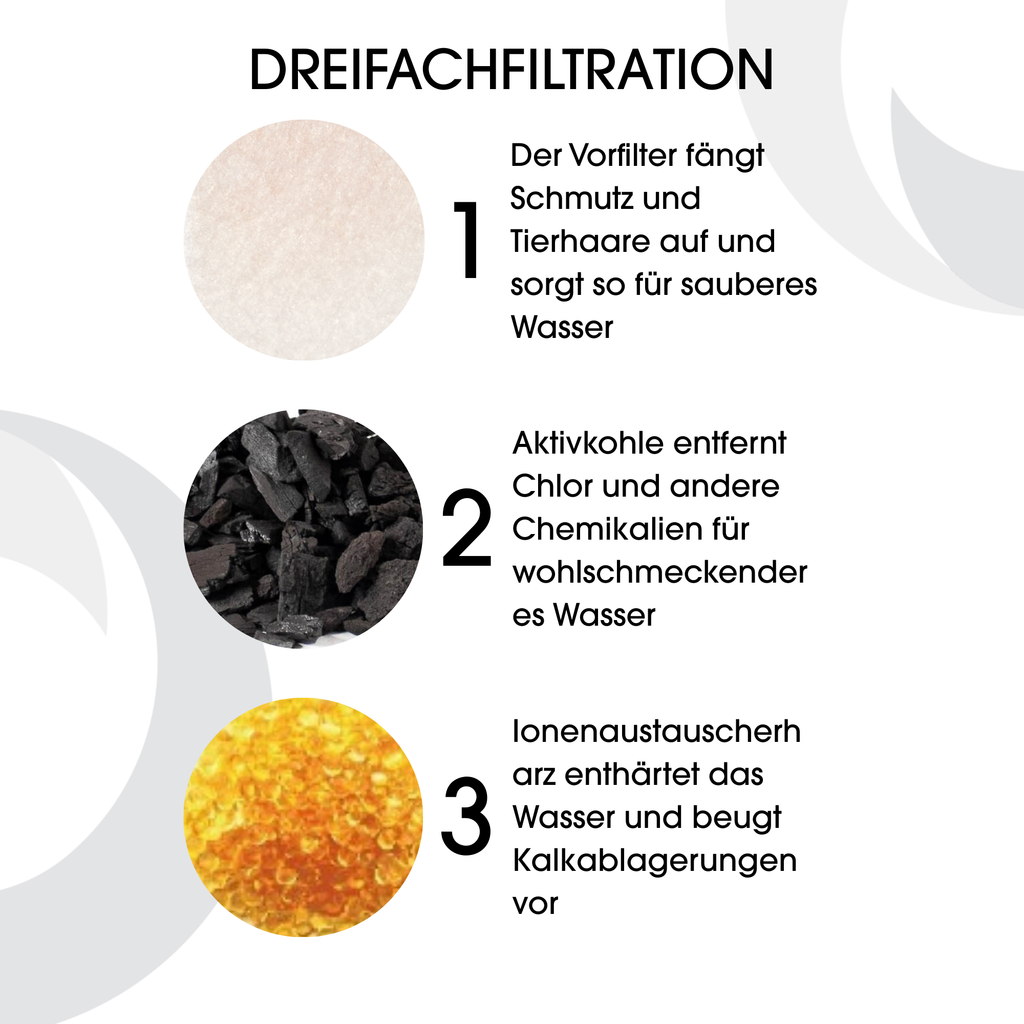 Der Filter ist ein wesentlicher Bestandteil Ihres Haustier-Trinkbrunnens und hält das Wasser zuverlässig sauber. Die dreistufigen Trinkbrunnenfilter sind sowohl für hartes als auch für weiches Wasser geeignet und sorgen für rundum zufriedene Vierbeiner.